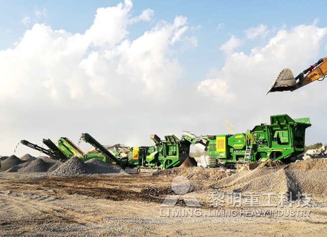 700-900mm的原料進入J45顎破履帶移動破碎站進行粗碎,而后粗碎后的物料進入I44R反擊破履帶移動破碎站進行二段破碎。二段破碎后,大于31.5mm的物料通過循環(huán)篩返料皮帶送回反擊破繼續(xù)破碎,31.5mm以下的混合料輸送到S130履帶式篩分移動站,經(jīng)過三層篩網(wǎng)的分離,分出0-5/5-10/10-20/20-31.5四種成品料。